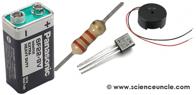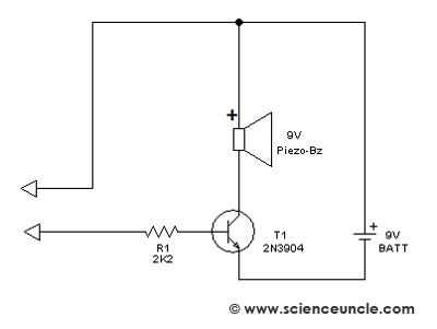 ഇനി ഈ ഘടകങ്ങളെ ചിത്രത്തില് കാണിച്ചിരിക്കുന്നതുപോലെ (സ്കീമാറ്റിക് ഡയഗ്രവും ഒപ്പം നല്കുന്നു) ബ്രെഡ്ബോര്ഡില് ഉറപ്പിച്ച് നിര്മ്മാണം പൂര്ത്തിയാക്കുക.എല്ലാം ഭദ്രമെന്ന് ഉറപ്പായാല് അലാം പ്രവര്ത്തിപ്പിച്ചു നോക്കാം.ഇവിടെ ട്രാന്സിസ്റ്ററിണ്റ്റെ മൂന്ന് കാലുകളും ബാറ്ററിയുടെ പോസിറ്റീവും നെഗറ്റീവും അഗ്രങ്ങളും പീസോ-ബസറിണ്റ്റെ ചുവപ്പും കറുപ്പും വയറുകളും തെറ്റാതെ തന്നെ യോജിപ്പിക്കാന് ശ്രദ്ധിക്കണം.ഇതേത്തുടര്ന്ന് മറ്റൊരു സര്ക്യൂട്ട് കൂടി നല്കുന്നുണ്ട്.ഇതില് മന:പൂര്വ്വം തന്നെ യാതൊരു വിശദീകരണവും ഇപ്പോള് നല്കിയിട്ടില്ല.ഈ സ്കീമാറ്റിക് ഡയഗ്രം പഠിച്ച ശേഷം സര്ക്യൂട്ട് ഘടകങ്ങളെല്ലാം വാങ്ങി യോജിപ്പിച്ചെടുത്ത് പ്രവര്ത്തിപ്പിക്കാന് ശ്രമിക്കുക.ശരിയായാലും ഇല്ലെങ്കിലും വിവരം അറിയിക്കണം.എന്തിനാണ് ഈ പരീക്ഷയെന്നല്ലേ ചോദ്യം?പരീക്ഷയും ഇടയ്ക്കിടെ വേണം. കാരണം പ്രവൃത്തി പരിചയം ഇലക്ട്രോണിക്സില് പരമപ്രധാനമാണ്!