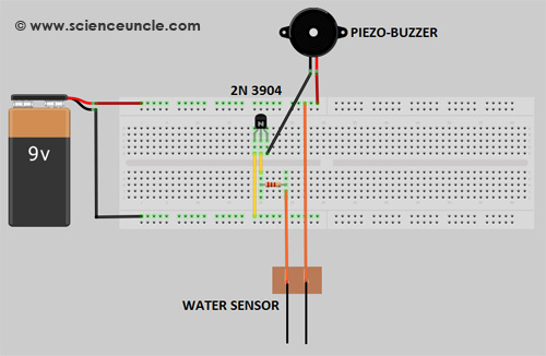 ഇതാണ് ബ്രെഡ്ബോര്ഡില് ആദ്യമായി നാം ചെയ്തെടുക്കാന് പോകുന്ന ചെറിയൊരു ഇലക്ട്രോണിക് സര്ക്യൂട്ട്.ഇതാണ് വാട്ടര് അലാം! അതായത് സര്ക്യൂട്ടിണ്റ്റെ ഇന്പുട്ട് പോയിണ്റ്റുകളില് വെള്ളം തട്ടിയാല് അപ്പോള്ത്തന്നെ ഉച്ചത്തില് ശബ്ദം മുഴക്കുന്ന ഏറ്റവും ലളിതമായൊരു സര്ക്യൂട്ട് എന്നു പറയാം.ഈ സര്ക്യൂട്ടിനെ മഴ പെയ്യുമ്പോള് പ്രവര്ത്തിക്കുന്ന “റെയിന് അലാം” ആയും വാട്ടര് ടാങ്കില് വെള്ളം നിറഞ്ഞ് പുറത്തേക്കൊഴുകിയാല് അതറിയിക്കുന്ന “വാട്ടര് ടാങ്ക് ഓവര്ഫ്ളോ അലാം” ആയും ഒക്കെ അവരവരുടെ അഭിരുചിയ്ക്കനുസരിച്ച് ഉപയോഗിക്കാവുന്നതാണ്.സര്ക്യൂട്ടിണ്റ്റെ ഇന്പുട്ട് പോയിണ്റ്റുകളാണ് ഒന്ന്,രണ്ട് എന്നിങ്ങനെ അടയാളം ചെയ്തിരിക്കുന്നത്.ഈ പോയിണ്റ്റുകള് ഓരോ ചെറു ചെമ്പുകമ്പിയുമായി ബന്ധിപ്പിച്ച് (അല്ലെങ്കില് തയ്യല് സൂചിയായാലും മതി) ഒരു സെണ്റ്റിമീറ്റര് അകലത്തില് അപ്പുറമിപ്പുറമായി ഒരു കാര്ഡ്ബോര്ഡ് കഷണത്തില് ഉറപ്പിക്കാമെങ്കില് വളരെ നന്നായിരിക്കും.എന്നിട്ട് ഈ “സെന്സര്” ഭാഗത്തെ വെള്ളം വീഴാനിടയുള്ള ഭാഗത്ത് വച്ച ശേഷം ചെറിയ വയറുകള് കൊണ്ട് സര്ക്യൂട്ടിണ്റ്റെ ബാക്കി ഭാഗവുമായി ബന്ധിപ്പിച്ചാല് മതി.വയറുകള് ഒരുപാട് നീളത്തില് ഇടാതിരിക്കുന്നതാണ് നല്ലത്.ഇരുപത് മീറ്റര് വരെയൊക്കെ വയര്നീളത്തില് കുഴപ്പമില്ലാതെ പ്രവര്ത്തിപ്പിക്കാം. 2.2കിലോ ഓം റെസിസ്റ്റര് ഒരെണ്ണവും ഒന്പത് വോള്ട്ട് പീസോ-ബസര് ഒരെണ്ണവും രണ്ട്എന് മൂവായിരത്തി തൊള്ളായിരത്തി നാല് എന്ന് നമ്പരുള്ള എന്.പി.എന് ട്രാന്സിസ്റ്റര് ഒരെണ്ണവും ഇതിനായി കരുതുക.പിന്നെ വേണ്ടത് ഒന്പതു വോള്ട്ടിണ്റ്റെ ആല്ക്കലൈന് ബാറ്ററിയും ബ്രെഡ്ബോര്ഡും വയര്ത്തുണ്ടുകളും മാത്രമാണ്.. റെഡി?